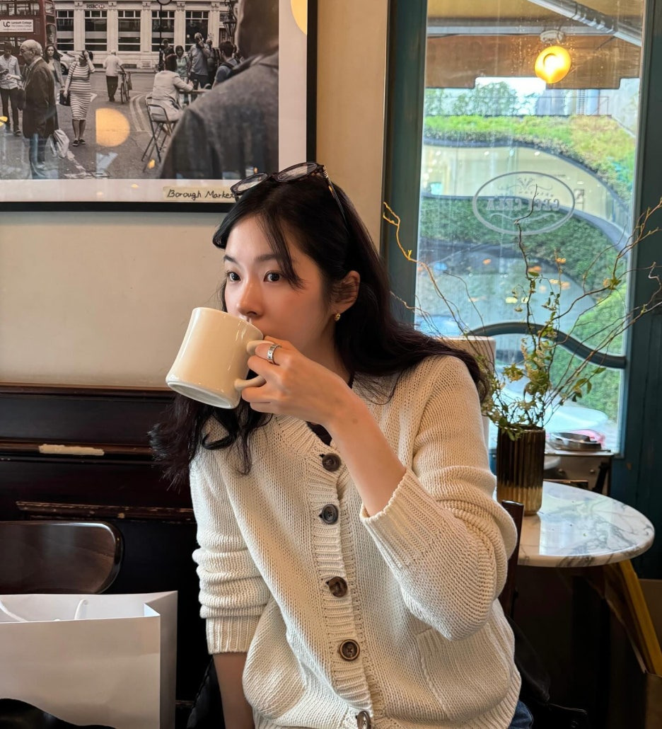 아이보리 가디건 하나만으로도 카페 분위기랑 잘 어울리는 산뜻한 데이트룩이에요. 도톰한 짜임 덕분에 한겨울엔 코트 안 이너로, 간절기에는 단독으로 활용하기 좋아요. 큰 우드 버튼이 포인트라 액세서리는 최소한으로만 얹어도 충분히 예뻐요. 하의는 데님이나 슬랙스 어디에나 무난하게 잘 어울리는 코디예요.