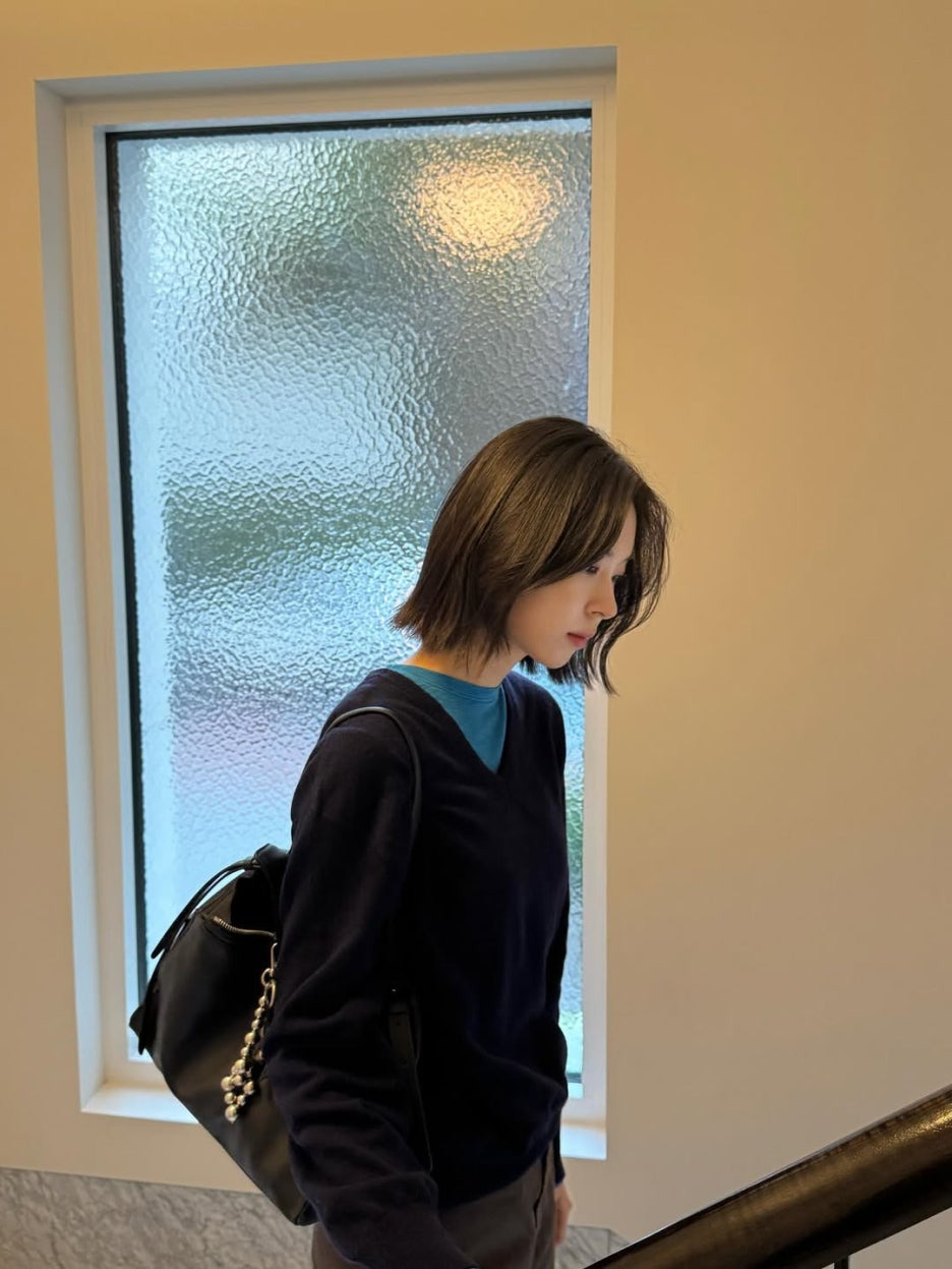 네이비 브이넥 니트 안에 쿨한 블루 이너를 받쳐 입은 레이어드 룩이에요. 얼굴 쪽으로 컬러가 모이면서 시선이 자연스럽게 위로 올라가 전체 비율이 좋아 보이에요. 하의는 차분한 그레이 톤으로 맞춰서 상의 컬러가 더 살아나죠. 블랙 백팩과 진주 키링으로 귀여운 포인트까지 챙긴 실용적인 데일리룩이에요.