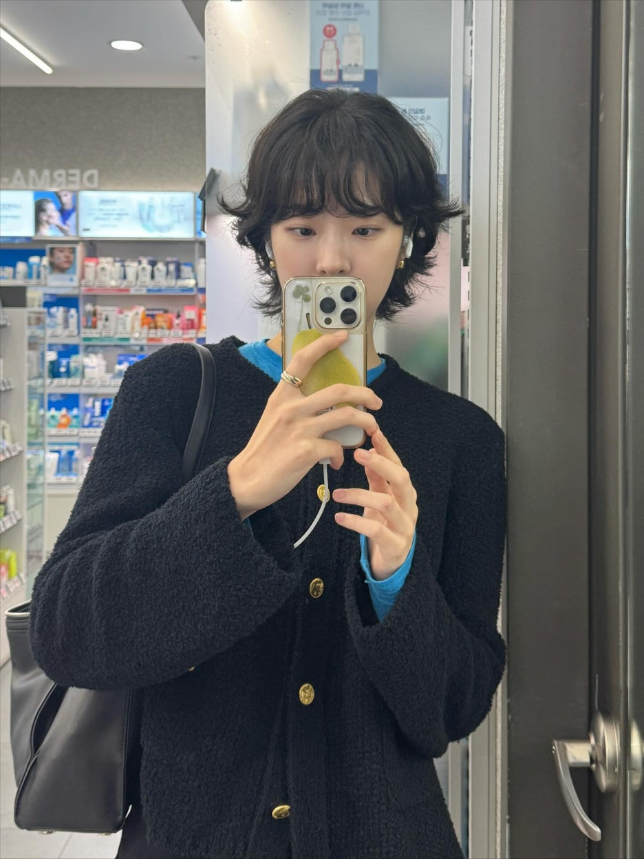 블루 이너 위에 블랙 트위드 느낌의 가디건을 입은 포인트 상의 코디예요. 골드 버튼이 있어 특별한 액세서리 없이도 충분히 화려해 보이고요. 이너 컬러가 쨍해서 얼굴이 화사해 보이는 효과도 있어요. 하의는 블랙 팬츠나 진청 데님으로 맞춰주면 약속 있을 때 부담 없이 입기 좋은 꾸안꾸 룩이에요.